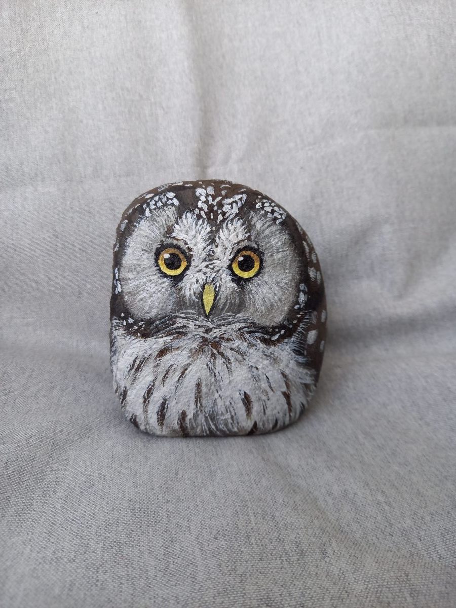 Akryyliväreillä luonnonkiveen maalattu helmipöllö