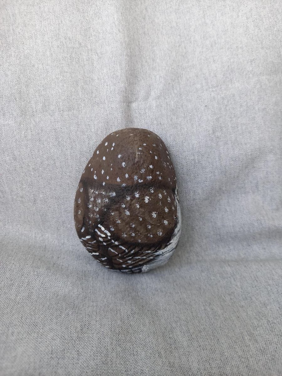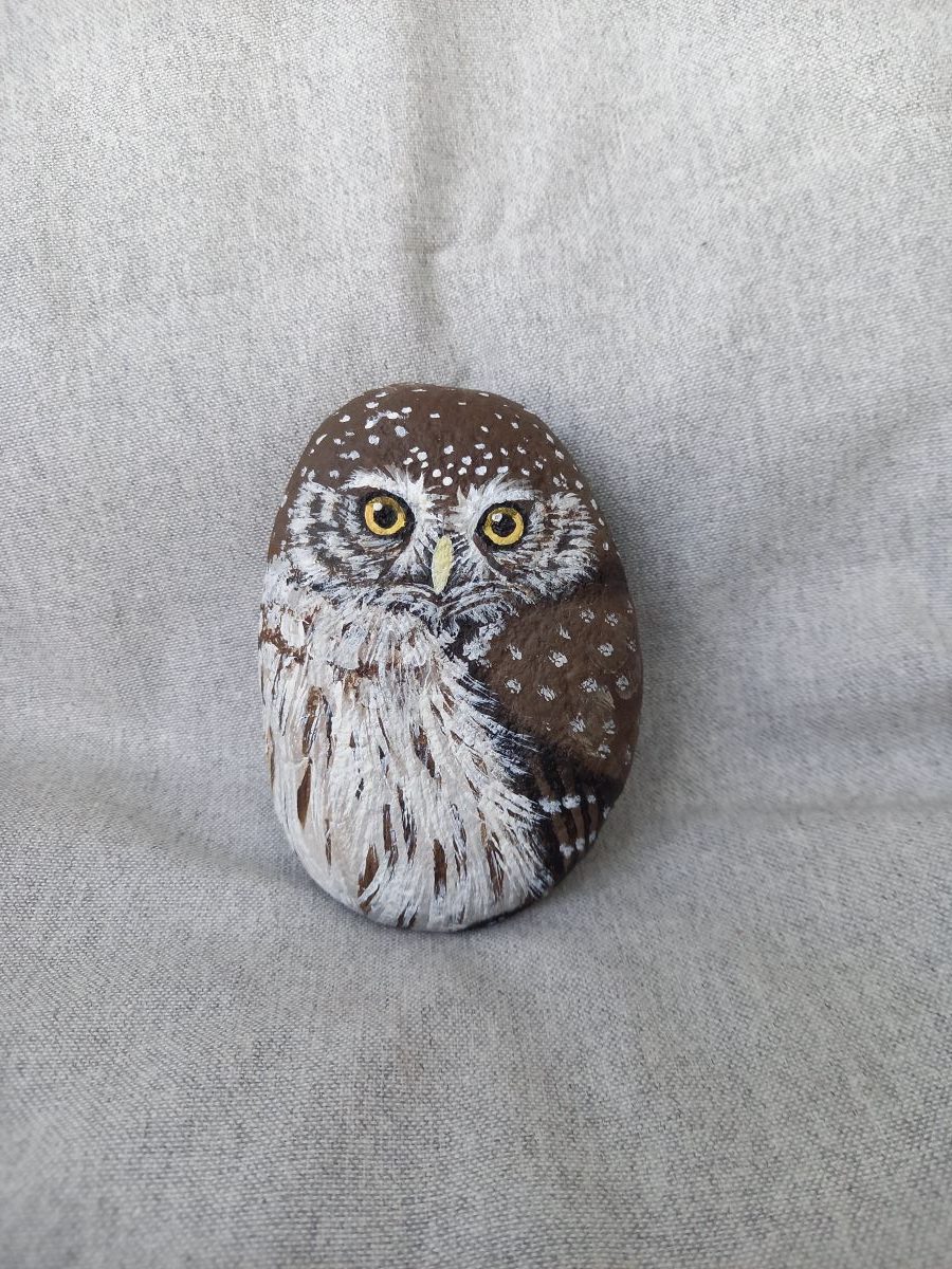 Akryyliväreillä luonnonkiveen maalattu varpuspöllö