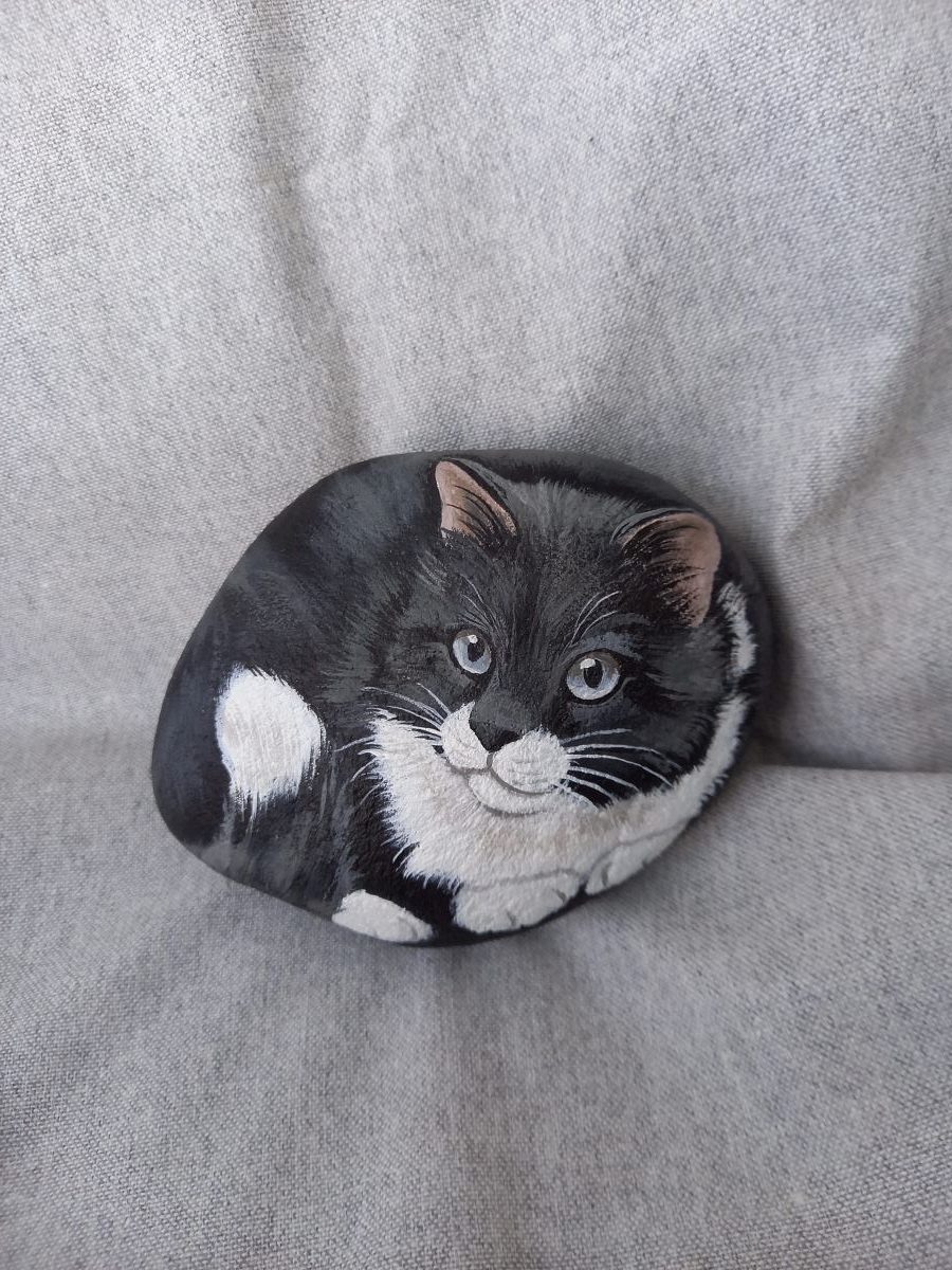 Akryyliväreillä maalattu mustavalkoinen kivikissa