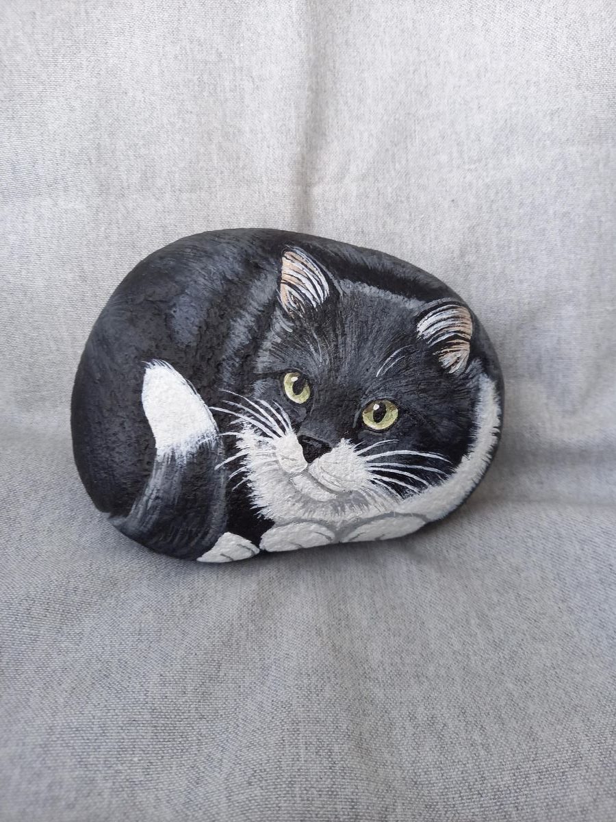 Akryyliväreillä maalattu mustavalkoinen kivikissa